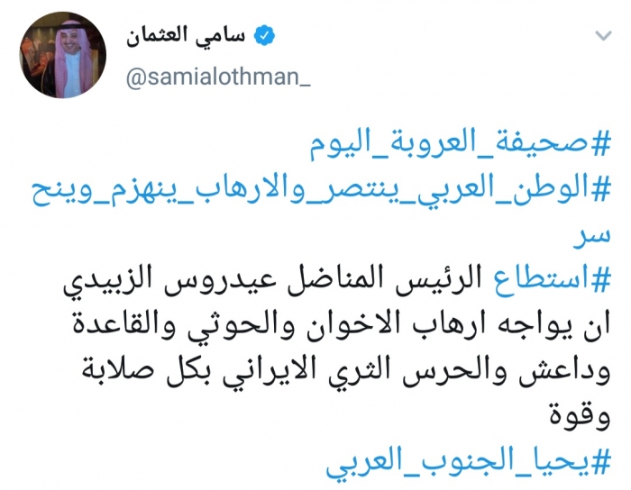 وكتب العثمان، في تغريدة له عبر موقع التواصل الاجتماعي تويتر، تابعها المشهد العربي: "استطاع الرئيس المناضل عيدروس الزُبيدي أن يواجه إرهاب الإخوان والحوثي والقاعدة وداعش والحرس الثوري الإيراني بكل صلابة وقوة".
