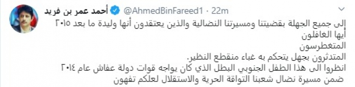 وقال في تغريدة عبر "تويتر" رصدها "المشهد العربي": "إلى جميع الجهلة بقضيتنا ومسيرتنا النضالية والذين يعتقدون أنها وليدة ما بعد ٢٠١٥ أيها الغافلون المتغطرسون المتدثرون بجهل يتحكم به غباء منقطع النظير. انظروا الى هذا الطفل الجنوبي البطل الذي كان يواجه قوات دولة عفاش عام ٢٠١٤ ضمن مسيرة نضال شعبنا التواقة الحرية والاستقلال لعلكم تفهمون".