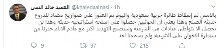 قال الكاتب والمحلل العسكري العميد خالد النسي، اليوم، إن حصول مليشيات الحوثي على أسلحة استراتيجية حديثة لن يحدث إلا بتواطؤ قيادات في حكومة الشرعية.