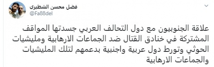 وكتب في تغريدة عبر "تويتر" رصدها "المشهد العربي": "علاقة الجنوبيون مع دول التحالف العربي جسدتها المواقف المشتركة في خنادق القتال ضد الجماعات الإرهابية ومليشيات الحوثي وتورط دول عربية وأجنبية بدعمهم لتلك المليشيات والجماعات الإرهابية – في إشارة لإيران وقطر-".