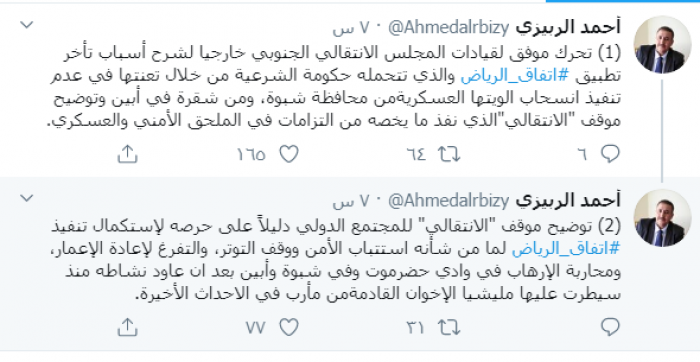 وكتب الربيزي عبر "تويتر":" تحرك موفق لقيادات المجلس الانتقالي الجنوبي خارجيا لشرح أسباب تأخر تطبيق اتفاق الرياض والذي تتحمله حكومة الشرعية من خلال تعنتها في عدم تنفيذ انسحاب ألويتها العسكرية من محافظة شبوة، ومن شقرة في أبين وتوضيح موقف "الانتقالي"الذي نفذ ما يخصه من التزامات في الملحق الأمني والعسكري.