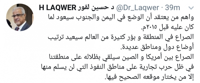 وكتب لقور، في تغريدة له عبر موقع التواصل الاجتماعي تويتر، تابعها المشهد العربي: "واهم من يعتقد أن الوضع في اليمن والجنوب سيعود لما كان عليه قبل ٢٠١٥م".