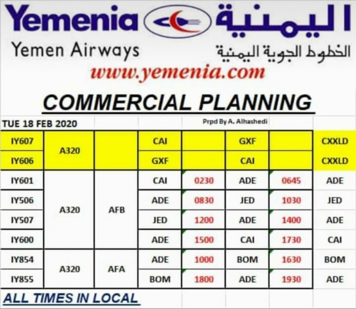 ينشر "المشهد العربي" مواعيد رحلات طيران اليمنية غداً الثلاثاء، الموافق 18 فبراير 2020.