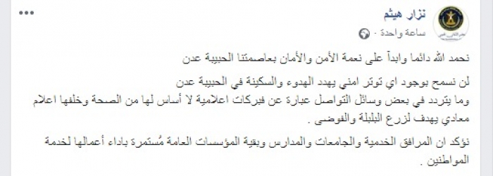 وأكد أن المجلس الانتقالي لن يسمح بأي محاولات تهدف السكينة في العاصمة عدن قائلا :" نحمد الله دائما وأبدا على نعمة الأمن والأمان بعاصمتنا الحبيبة عدن، لن نسمح بوجود اي توتر امني يهدد الهدوء والسكينة في الحبيبة عدن،لن نسمح بوجود اي توتر امني يهدد الهدوء والسكينة في الحبيبة عدن".