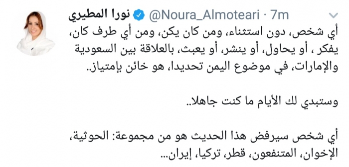وكتبت المطيري، في تغريدة لها على موقع التواصل الاجتماعي تويتر، تابعها المشهد العربي: "أي شخص، دون استثناء، ومن كان يكن، ومن أي طرف كان، يفكر، أو يحاول، أو ينشر، أو يعبث، بالعلاقة بين السعودية والإمارات، في موضوع اليمن تحديدا، هو خائن بإمتياز".