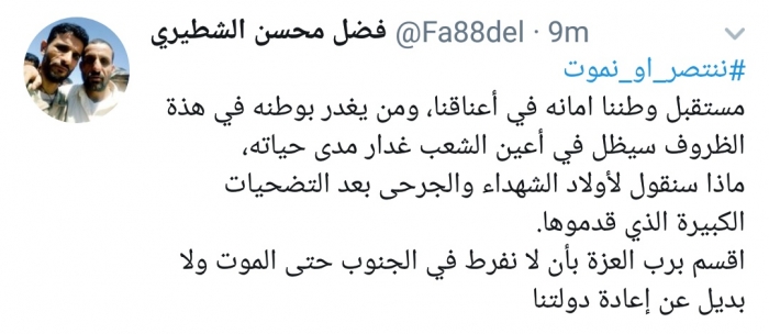 تحت شعار "ننتصر أو نموت"، أكد رئيس دائرة الشباب بالمجلس الانتقالي الجنوبي فضل محسن الشطيري، أن مستقبل الجنوب أمانة في أعناق أبنائه.