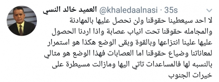أكد الناشط السياسي العميد خالد النسي، أن أبناء الجنوب لن ينتزعوا حقوقهم إلا بالقوة.
