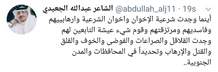 أكد الشاعر عبدالله الجعيدي، أن الفوضى والإرهاب والقتل يلازمون إخوان الشرعية أينما ذهبوا.