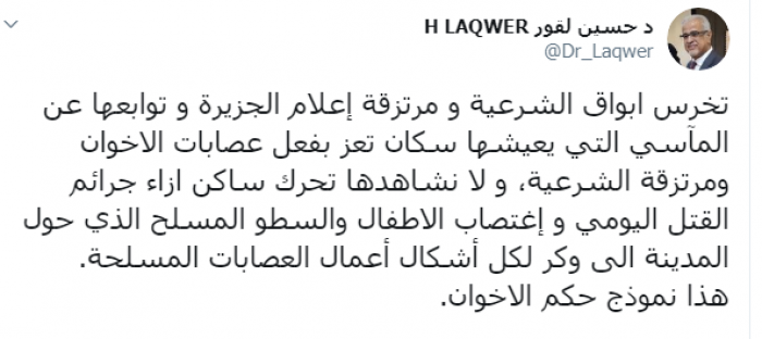 وكتب لقور عبر "تويتر":"تخرس أبواق الشرعية و مرتزقة إعلام الجزيرة و توابعها عن المآسي التي يعيشها سكان تعز بفعل عصابات الإخوان ومرتزقة الشرعية".