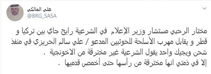 وقال في تغريدة عبر "تويتر" رصدها "المشهد العربي": "مختار الرحبي مستشار وزير الإعلام في الشرعية رايح جاي بين تركيا وقطر ويقابل مهرب الأسلحة للحوثيين المدعو علي سالم الحريزي في منفذ شحن ويجيك واحد يقول الشرعية غير مخترقة من الإخونجية. إلا في ذمتي أنها مخترقة من رأسها حتى أخمص قدميها".