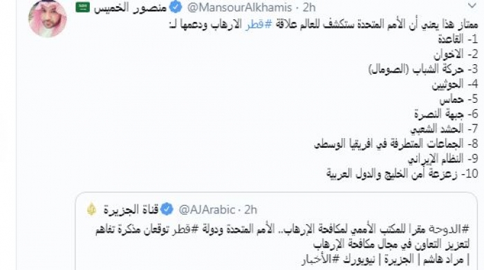 وقال في تغريدة عبر "تويتر" رصدها "المشهد العربي": "ممتاز هذا يعني أن الأمم المتحدة ستكشف للعالم علاقة قطر الإرهاب ودعمها لـ: القاعدة، الإخوان، حركة الشباب (الصومال)، الحوثيين، حماس، جبهة النصرة، الحشد الشعبي، الجماعات المتطرفة في افريقيا الوسطى، النظام الإيراني، زعزعة أمن الخليج والدول العربية".