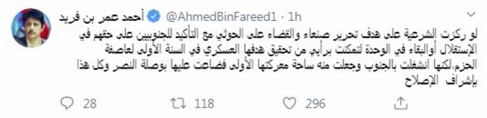 وكتب في تغريدة عبر "تويتر" رصدها "المشهد العربي": "لو ركزت الشرعية على هدف تحرير صنعاء والقضاء على الحوثي مع التأكيد للجنوبيين على حقهم في الاستقلال أوالبقاء في الوحدة لتمكنت برأيي من تحقيق هدفها العسكري في السنة الأولى لعاصفة الحزم، لكنها انشغلت بالجنوب وجعلت منه ساحة معركتها الأولى فضاعت عليها بوصلة النصر وكل هذا بإشراف الإصلاح".