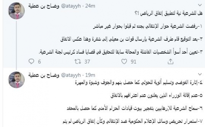 وأضاف: "عدم إقالة الوزراء الذين يعلنون عدم اعترافهم بالاتفاق.. سماح الشرعية للإرهابيين بتفجير بيوت قيادات الحزام الأمني كما حصل بالمحفد.. استمرار تحريض وسائل الإعلام الحكومية ضد الانتقالي وكأن اتفاق الرياض لم يتم".