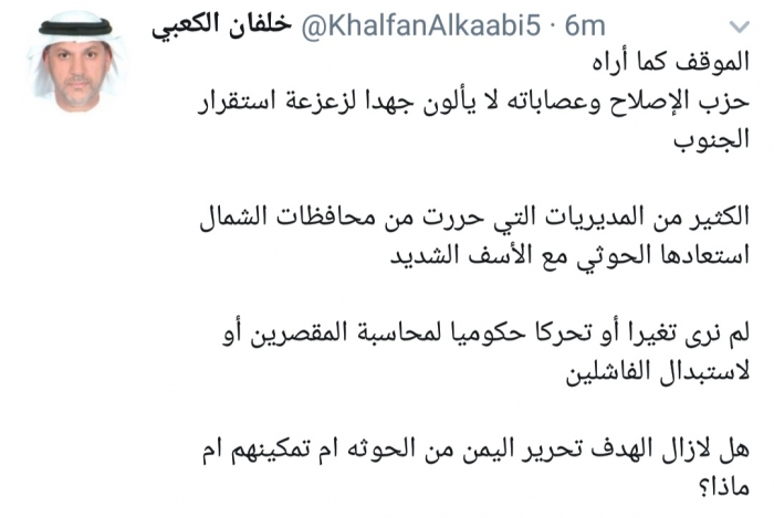 وكتب الكعبي، في تغريدة له عبر موقع التواصل الاجتماعي تويتر، تابعها المشهد العربي: "الموقف كما أراه.. حزب الإصلاح وعصاباته لا يألون جهدا لزعزعة استقرار الجنوب".