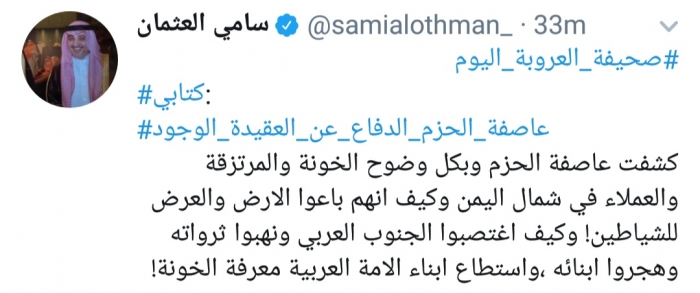 وكتب العثمان، في تغريدة له عبر موقع التواصل الاجتماعي تويتر، تابعها المشهد العربي: "كشفت عاصفة الحزم وبكل وضوح الخونة والمرتزقة والعملاء في شمال اليمن وكيف أنهم باعوا الأرض والعرض للشياطين، وكيف اغتصبوا الجنوب العربي ونهبوا ثرواته وهجروا أبنائه، واستطاع أبناء الأمة العربية معرفة الخونة".