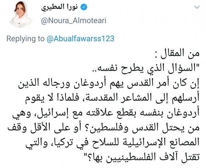 وكتبت المطيري، في تغريدة لها عبر موقع التواصل الاجتماعي تويتر، تابعها المشهد العربي: "السؤال الذي يطرح نفسه.. إن كان أمر القدس يهم أردوغان ورجاله الذين أرسلهم إلى المشاعر المقدسة، فلماذا لا يقوم أردوغان بنفسه بقطع علاقته مع إسرائيل، وهي من يحتل القدس وفلسطين؟".