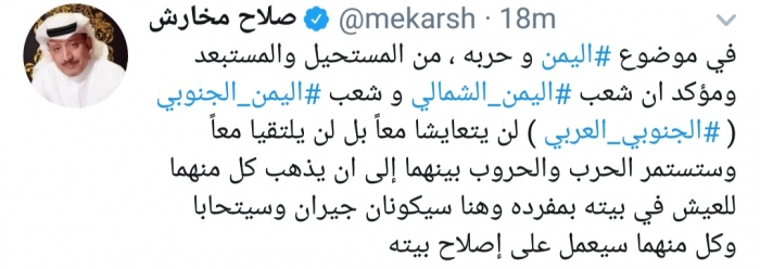 وكتب مخارش، في تغريدة له على موقع التواصل الاجتماعي تويتر، تابعها المشهد العربي: "في موضوع اليمن و حربه، من المستحيل والمستبعد ومؤكد أن شعب اليمن الشمالي وشعب الجنوب العربي لن يتعايشا معاً بل لن يلتقيا معاً".