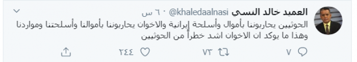 وكتب النسي عبر "تويتر":"الحوثيين يحاربوننا بأموال وأسلحة إيرانية والإخوان يحاربوننا بأموالنا وأسلحتنا ومواردنا".
