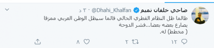 وكتب خلفان عبر "تويتر ":"طالما ظل النظام القطري الحالي قائما سيظل الوطن العربي ممزقايصارع بعضه بعضا".