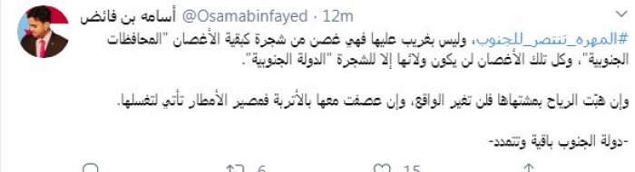 تفاعل الكاتب الصحفي أسامة بن فائض، مع هاشتاج المهرة تنتصر للجنوب.