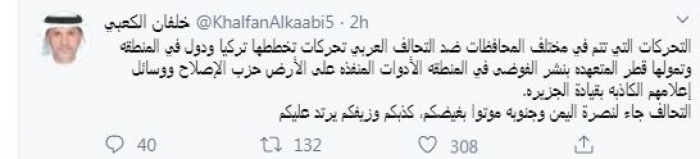 وقال في تغريدة عبر "تويتر" رصدها "المشهد العربي": "التحركات التي تتم في مختلف المحافظات ضد التحالف العربي تحركات تخططها تركيا ودول في المنطقة وتمولها قطر المتعهدة بنشر الفوضى في المنطقة الأدوات المنفذة على الأرض حزب الإصلاح ووسائل إعلامهم الكاذبة بقيادة الجزيرة. التحالف جاء لنصرة اليمن وجنوبه موتوا بغيضكم، كذبكم وزيفكم يرتد عليكم".