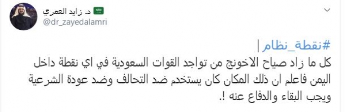 وقال في تغريدة عبر "تويتر" رصدها "المشهد العربي": "كل ما زاد صياح الإخونج من تواجد القوات السعودية في أي نقطة داخل اليمن فاعلم أن ذلك المكان كان يستخدم ضد التحالف وضد عودة الشرعية ويجب البقاء والدفاع عنه".