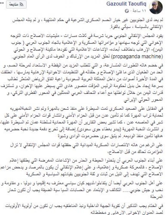 قال الإعلامي المغربي توفيق جازوليت، اليوم، إن حكومة الشرعية أصبحت في حكم المنتهية، مشيرًا إلى أنه لم يعد لدى الجنوبيين غير خيار الحسم العسكري.