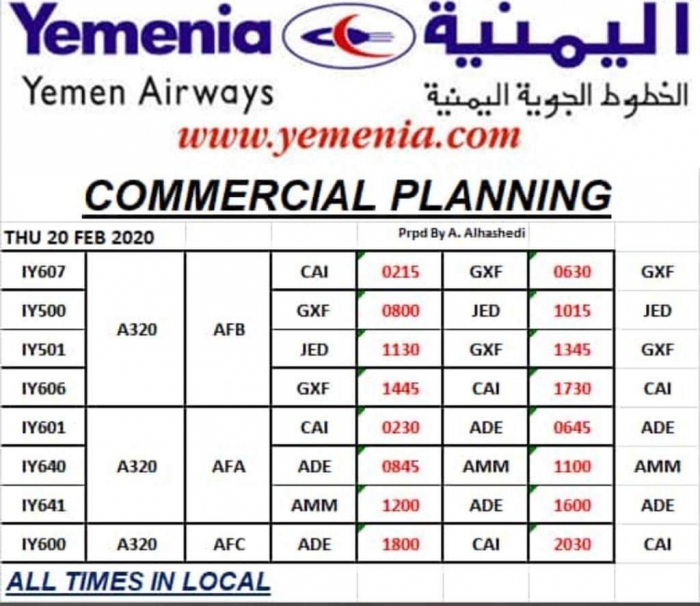 ينشر "المشهد العربي" مواعيد رحلات طيران اليمنية غداً الخميس، الموافق 20 فبراير 2020.