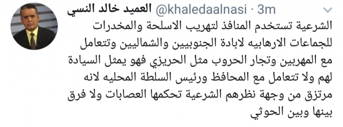 وكتب النسي، في تغريدة له عبر موقع التواصل الاجتماعي تويتر، تابعها المشهد العربي: "الشرعية تستخدم المنافذ لتهريب الأسلحة والمخدرات للجماعات الإرهابية لإبادة الجنوبيين والشماليين".