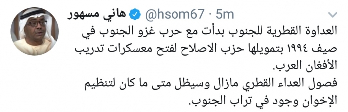 وكتب مسهور، في تغريدة له عبر موقع التواصل الاجتماعي تويتر، تابعها المشهد العربي: "العداوة القطرية للجنوب بدأت مع حرب غزو الجنوب في صيف ١٩٩٤ بتمويلها حزب الإصلاح لفتح معسكرات تدريب الأفغان العرب".