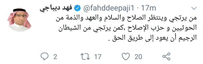 وكتب ديباجي، في تغريدة له عبر موقع التواصل الاجتماعي تويتر، تابعها المشهد العربي: "من يرتجي وينتظر الصلاح والسلام والعهد والذمة من الحوثيين وحزب الإصلاح كمن يرتجي من الشيطان الرجيم أن يعود إلى طريق الحق".