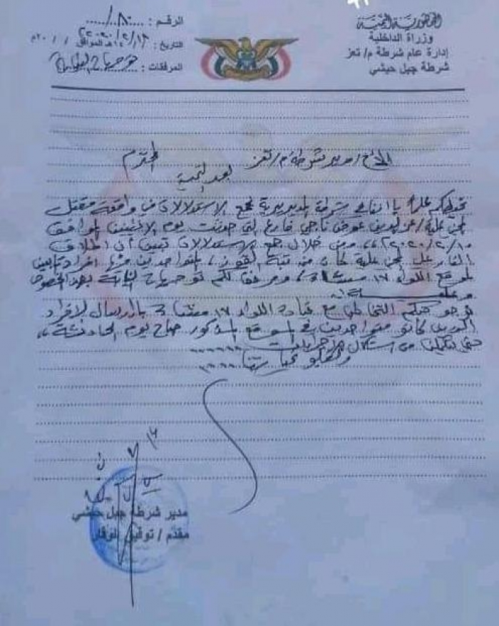 وطالبت إدارة أمن شرطة جبل حبشي اليوم الأربعاء، قيادة اللواء 17 مشاة بسرعة تسليم المتهمين، وذلك بعد أن وجهت نيابة تعز بإلقاء القبض على المدعو سلطان.