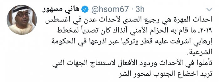 وكتب مسهور، في تغريدة له عبر موقع التواصل الاجتماعي تويتر، تابعها المشهد العربي: "ما قام به الحزام الأمني آنذاك كان تصدياً لمخطط إرهابي أشرفت عليه قطر وتركيا عبر أذرعها في الحكومة الشرعية".