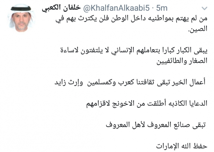 وكتب الكعبي، في تغريدة له عبر موقع التواصل الاجتماعي تويتر، تابعها المشهد العربي: "من لم يهتم بمواطنيه داخل الوطن فلن يكترث بهم في الصين".