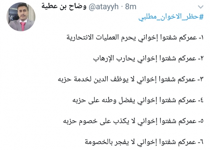 تفاعل عضو الجمعية الوطنية الجنوبية وضاح بن عطية، مع هاشتاج "حظر الإخوان مطلبي".