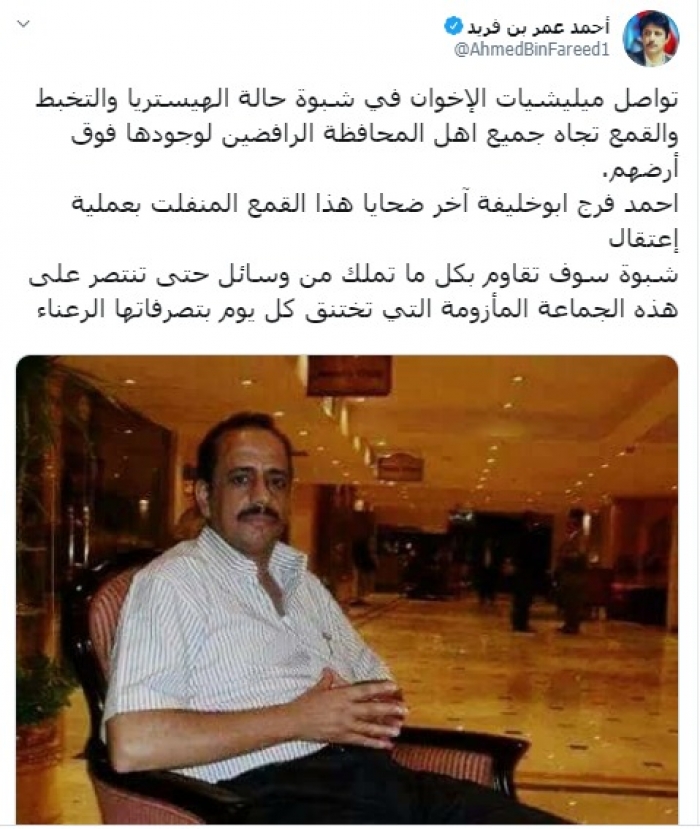 بن فريد يعلق على اعتقال أحمد فرج أبوخليفة من قبل مليشيا الإخوان في شبوة