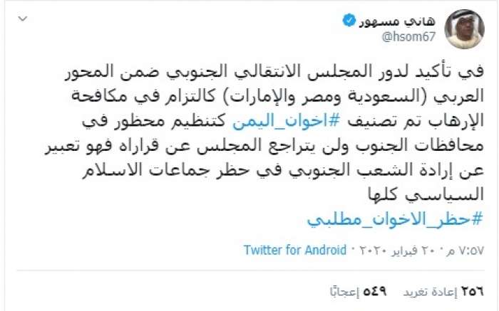 وكتب "مسهور" في تغريدة عبر حسابه بتويتر، رصدها "المشهد العربي": " في تأكيد لدور المجلس الانتقالي الجنوبي ضمن المحور العربي (السعودية ومصر والإمارات) كالتزام في مكافحة الإرهاب تم تصنيف #إخوان _ اليمن، كتنظيم محظور في محافظات الجنوب".