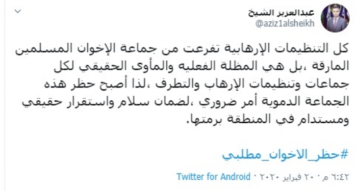 وكتب "الشيخ" في تغريدة عبر تويتر، رصدها "المشهد العربي": "كل التنظيمات الإرهابية تفرعت من جماعة الإخوان المسلمين المارقة ،بل هي المظلة الفعليه والمأوى الحقيقي لكل جماعات وتنظيمات الإرهاب والتطرف ".