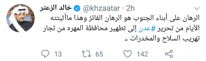 وكتب الزعتر، في تغريدة له عبر موقع التواصل الاجتماعي تويتر، تابعها المشهد العربي: "الرهان على أبناء الجنوب هو الرهان الفائز وهذا ما أثبتته الأيام من تحرير عدن إلى تطهير محافظة المهرة من تجار تهريب السلاح والمخدرات".