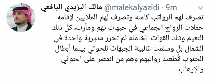 وكتب اليافعي، في تغريدة له عبر موقع التواصل الاجتماعي تويتر، تابعها المشهد العربي: "تصرف لهم الرواتب كاملة وتصرف لهم الملايين لإقامة حفلات الزواج الجماعي في جبهات نهم ومأرب".