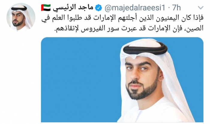 وكتب الرئيسي، في تغريدة له على موقع التواصل الاجتماعي تويتر، تابعها المشهد العربي: "فإذا كان اليمنيون الذين أجلتهم الإمارات قد طلبوا العلم في الصين، فإن الإمارات قد عبرت سور الفيروس لإنقاذهم".