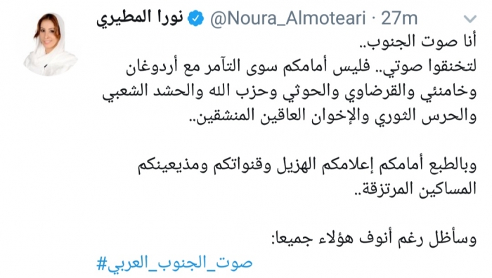 وكتبت المطيري، في تغريدة لها عبر موقع التواصل الاجتماعي تويتر، تابعها المشهد العربي: "أنا صوت الجنوب.. لتخنقوا صوتي.. فليس أمامكم سوى التآمر مع أردوغان وخامنئي والقرضاوي والحوثي وحزب الله والحشد الشعبي والحرس الثوري والإخوان العاقين المنشقين".