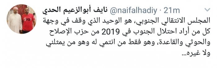 وكتب الحدي، في تغريدة له على موقع التواصل الاجتماعي تويتر، تابعها المشهد العربي: "المجلس الانتقالي الجنوبي، هو الوحيد الذي وقف في وجه كل من أراد احتلال الجنوب في 2019 من حزب الإصلاح والحوثي والقاعدة، وهو فقط من انتمي له وهو من يمثلني ولا غيره".
