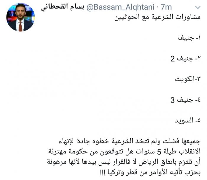 وكتب القحطاني، في تغريدة له على موقع التواصل الاجتماعي تويتر، تابعها المشهد العربي: "مشاورات الشرعية مع الحوثيين جنيف وجنيف 2 والكويت وجنيف 3 والسويد.. جميعها فشلت ولم تتخذ الشرعية خطوه جادة لإنهاء الانقلاب طيلة 5 سنوات".