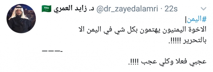 وكتب العمري، في تغريدة له على موقع التواصل الاجتماعي تويتر، تابعها المشهد العربي: "الأخوة اليمنيون يهتمون بكل شي في اليمن إلا بالتحرير.. عجبي فعلا وكلي عجب".