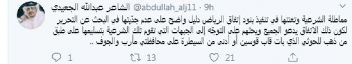 كشف الشاعر عبدالله الجعيدي، اليوم، سبب مماطلة حكومة الشرعية في تنفيذ بنود اتفاق الرياض.