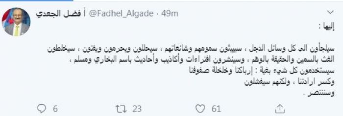 وقال في تغريدة عبر "تويتر" رصدها "المشهد العربي": "سيلجأون إلى كل وسائل الدجل، سييبثون سمومهم وشائعاتهم، سيحللون ويحرمون ويفتون، سيخلطون الغث بالسمين والحقيقة بالوهم، وسينشرون افتراءات وأكاذيب وأحاديث باسم البخاري ومسلم، سيستخدمون كل شيء بغية : إرباكنا وخلخلة صفوفنا وكسر إرادتنا، ولكنهم سيفشلون وسننتصر".