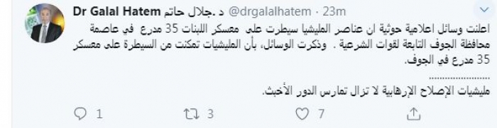 وقال في تغريدة عبر "تويتر" رصدها "المشهد العربي": "أعلنت وسائل إعلامية حوثية ان عناصر المليشيا سيطرت على معسكر اللبنات 35 مدرع في عاصمة محافظة الجوف التابعة لقوات الشرعية . وذكرت الوسائل، بأن المليشيات تمكنت من السيطرة على معسكر 35 مدرع في الجوف. مليشيات الإصلاح الإرهابية لا تزال تمارس الدور الأخبث".