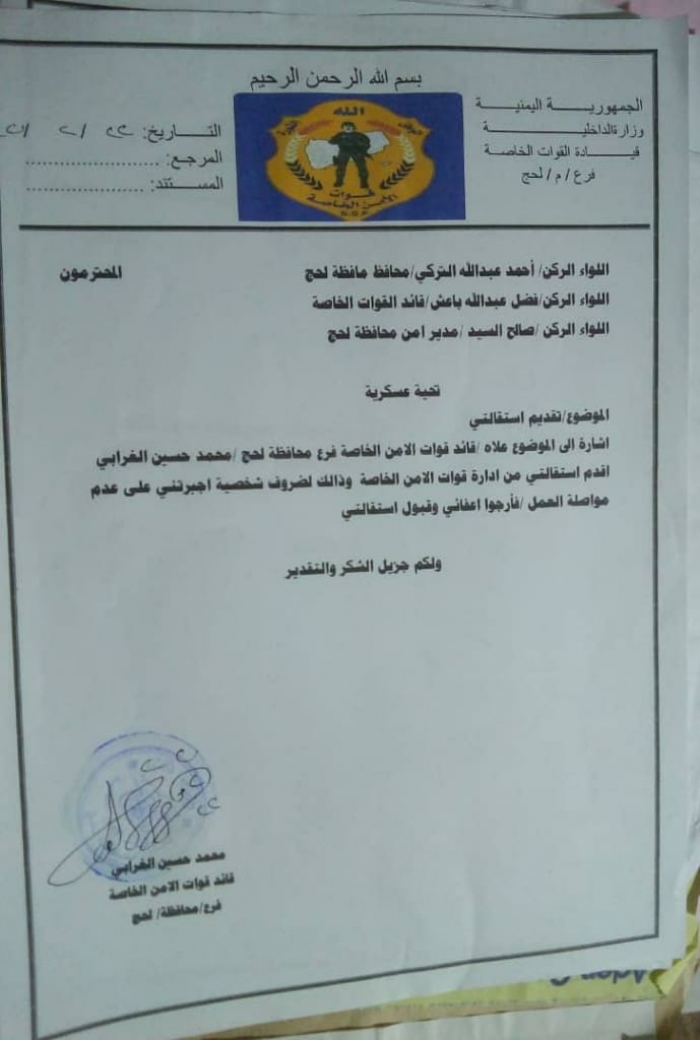 وطلب قائد القوات الخاصة في لحج – عبر خطاب رسمي - من القيادات الأمنية في المحافظة، إعفائه وقبول استقالته.