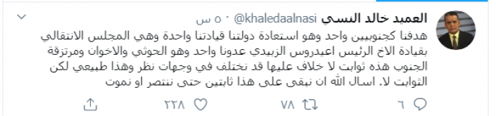 وكتب النسي عبر تويتر :"هدفنا كجنوبيين واحد وهو استعادة دولتنا قيادتنا واحدة وهي المجلس الانتقالي بقيادة الرئيس عيدروس الزبيدي".